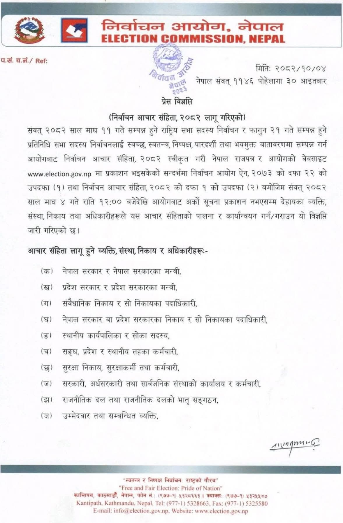 काठमाडौँ । निर्वाचन आयोगले सोमबारदेखि निर्वाचन आचारसंहिता लागू गर्ने भएको छ ।